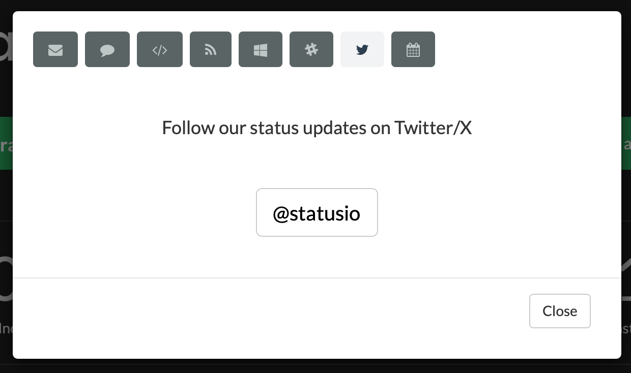 Once your Twitter/X account is connected, viewers of your status page will be able to follow your Twitter/X account from the Subscribe button.