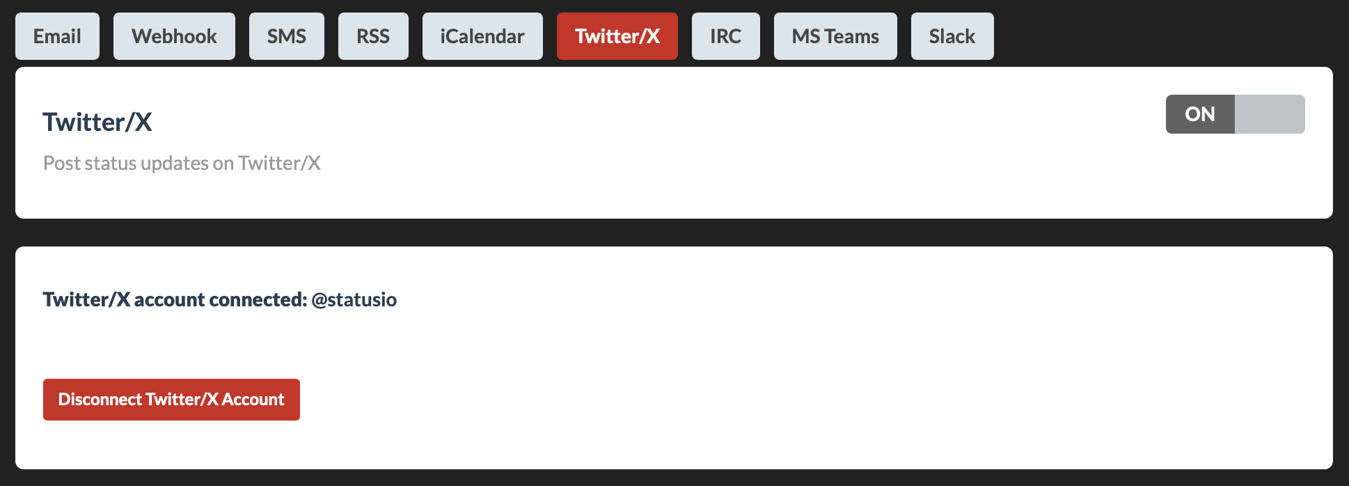 Post status updates to Twitter/X by connecting your Twitter/X account to Status.io.