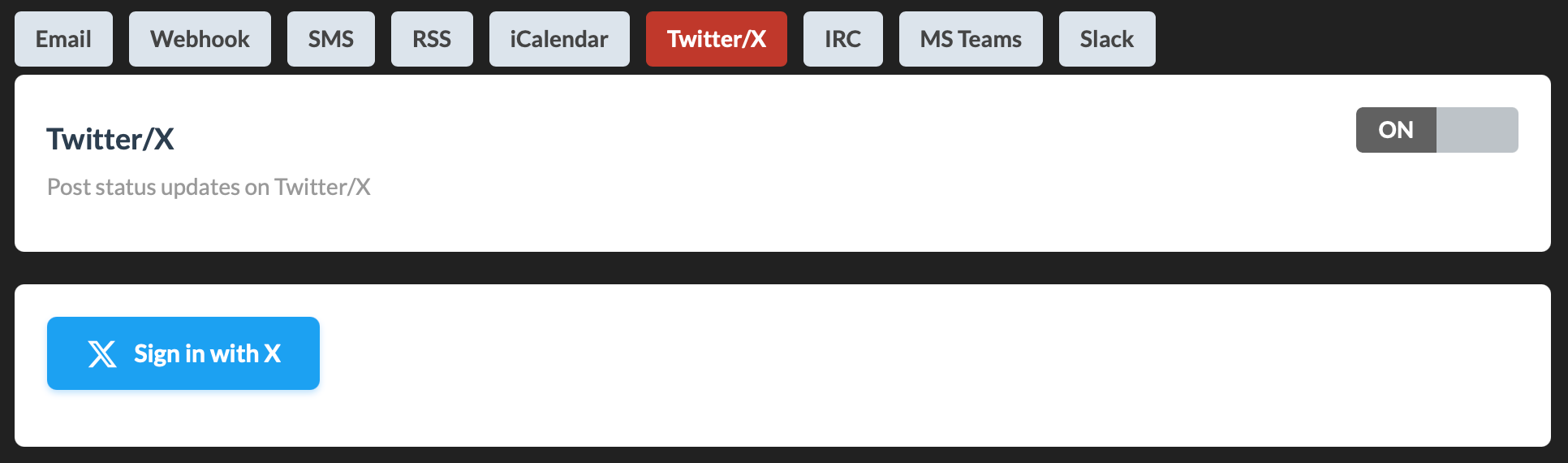 During incidents and maintenance you can choose to broadcast the status update to Twitter/X.